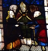 La baie 2 montre sur le tympan des anges portant des calices et sur les lancettes, saint Nicolas ressuscitant trois enfants et sainte Odile libérant son père des flammes du purgatoire.