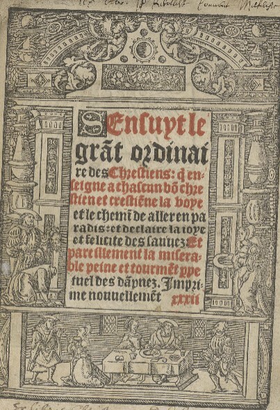 Michel de Barisey possède au début du XVIe siècle cet exemplaire du « Grant ordinaire des chrestiens ». Il s'agit d'une copie de l'édition originale de 1494 d'Antoine Vérard, imprimée à Paris en 1530 par Jean Trepperel. L'imprimé contient plusieurs ex-libris : celui de Michel de Barisey ("C'est a Michiel de Barisey"), celui du couvent des Récollets et celui de Christian Bolchen, qui récupère le livre après la Révolution française.