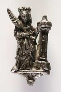 Cette toute petite pièce de métal est un souvenir de pèlerinage. Sainte barbe est reconnaissable aux attributs qu'elle porte : la tour où selon la légende son père l'a enfermée, la couronne rappelant ses origines princières légendaires, et la palme, qui témoigne de son martyre. Sainte Barbe (ou Barbara) est une des saintes protectrices les plus populaires de la fin du Moyen Âge, devient la patronne du pays de Metz et le sanctuaire de Sainte-Barbe un pèlerinage populaire pour les citadins : située à 17 km de la ville, l'église pouvait faire l'objet d'un aller-et-retour dans la journée. L'enseigne a été trouvée lors des fouilles du Petit Saulcy, sous la place de la Comédie.