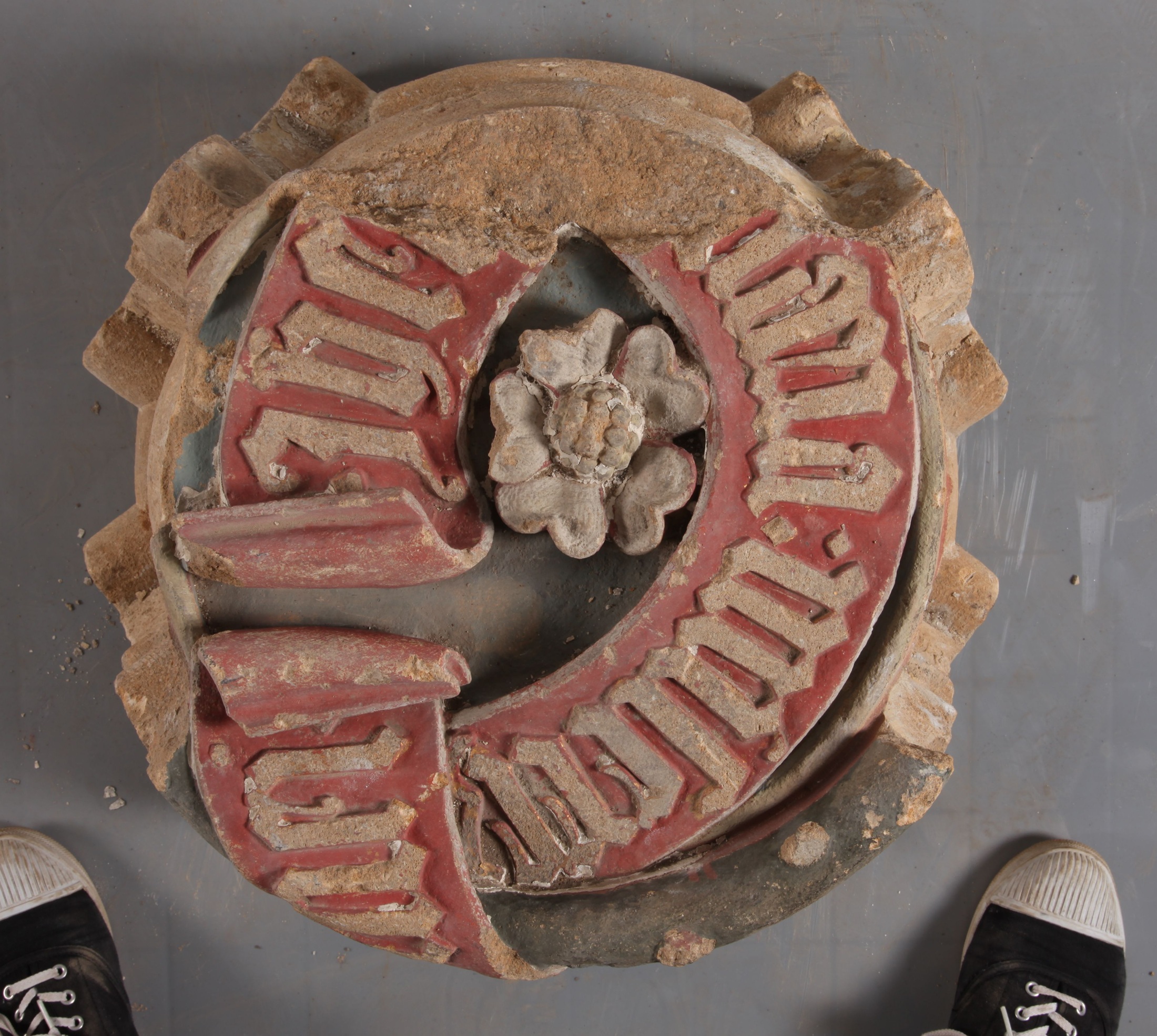 Actuellement au musée de la Cour d'or, cette clé de voûte provient de l'ancienne église Saint-Livier. Sculptée dans la pierre de Jaumont, elle a conservé sa riche polychromie. Un phylactère rouge entoure une fleur à cinq pétales. On peut y lire une inscription en faible relief : "... Jhe[su] Maria misere[re]" : Jésus et Marie, ayez pitié de nous. Cette clé est peut-être installée lors de la reconstruction de la nef en 1515.