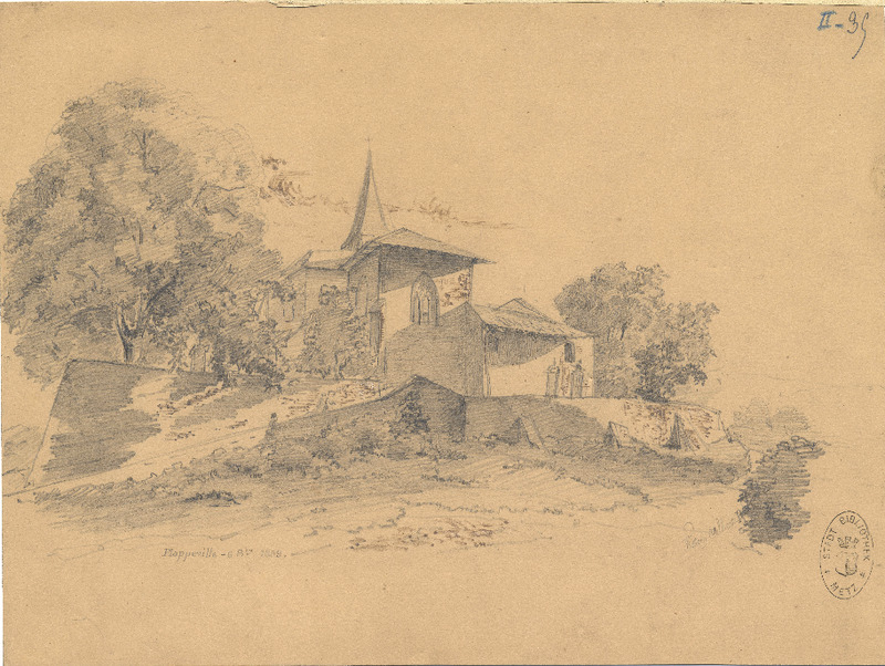 Treize ans après avoir dessiné une vue orientée vers l’ouest de l’église Sainte-Brigide de Plappeville, Migette en donne une vue cette fois-ci vers le sud. Nous pouvons constater l’évolution du bâti : on voit la nef, le transept et le contrefort sur son angle gauche du transept, ainsi que les vitraux du transept dont les remplages ne sont pas déterminés, mais qui suivent probablement le motif encore présent de trois baies sous deux quadrilobes et d’une ouverture en forme de pic. La façade latérale de la nef semble avoir été modifiée : Migette avait pu observer des petites ouvertures proches des deux extrémités de cette dernière, qui semblent aujourd’hui avoir été remplacées par des vitraux plus conséquents, constitués de deux baies surmontées d’un quadrilobe. Un bâtiment jouxtant le chœur a été ajouté après 1900. À l’extérieur, le mur d’enceinte de l’église a été remplacé par un ouvrage plus récent mais on distingue encore deux des trois contreforts, et l’espace vert a été creusé pour accueillir le monument aux morts du village.