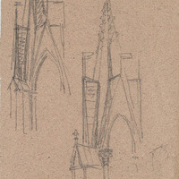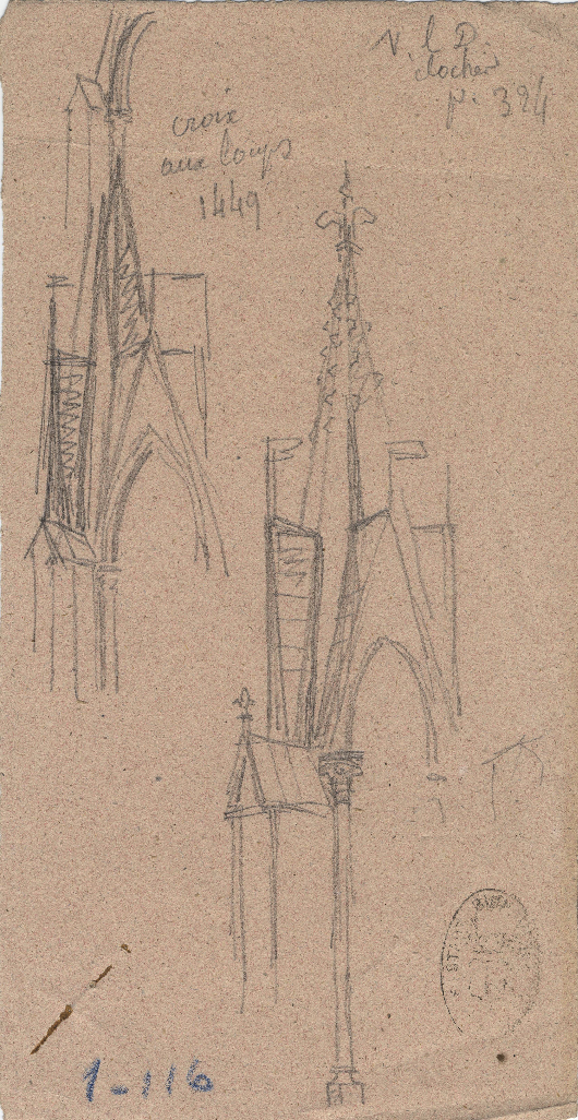 Enfin, ce dernier dessine les crochets présents sur le toit de la partie supérieure du bâtiment, constituée de huit faces ; elles sont surmontées d’un amortissement, absent du dessin sans doute du fait d’un manque de précision. La croix trônant au sommet de l’édifice connait le même sort, étant elle aussi absente de la représentation d’Auguste Migette, bien que visible sur d’autres.
