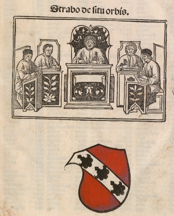 L'ouvrage contient deux livres imprimés reliés ensemble. Le premier est une édition de la Géographie de Strabon traduite en latin sous le titre De Situ urbis, et imprimée à Venise par Filippo Pinzi. Il comporte l'ex-libris des Heu en première page : un écu de gueules à la bande d'argent chargée de trois coquilles de sable peint en page de titre sous une gravure. L'écu est aussi dessiné à la fin du titre (fol. 150v). Il n'est pas clair, vu la date de publication de l'ouvrage, s'il appartenait à Nicolle III de Heu ou son fils Nicolle IV. Mais, compte tenu que ce dernier a fréquenté l'université d'Heidelberg, il est plus probable qu'il s'agisse de son propre ex-libris.